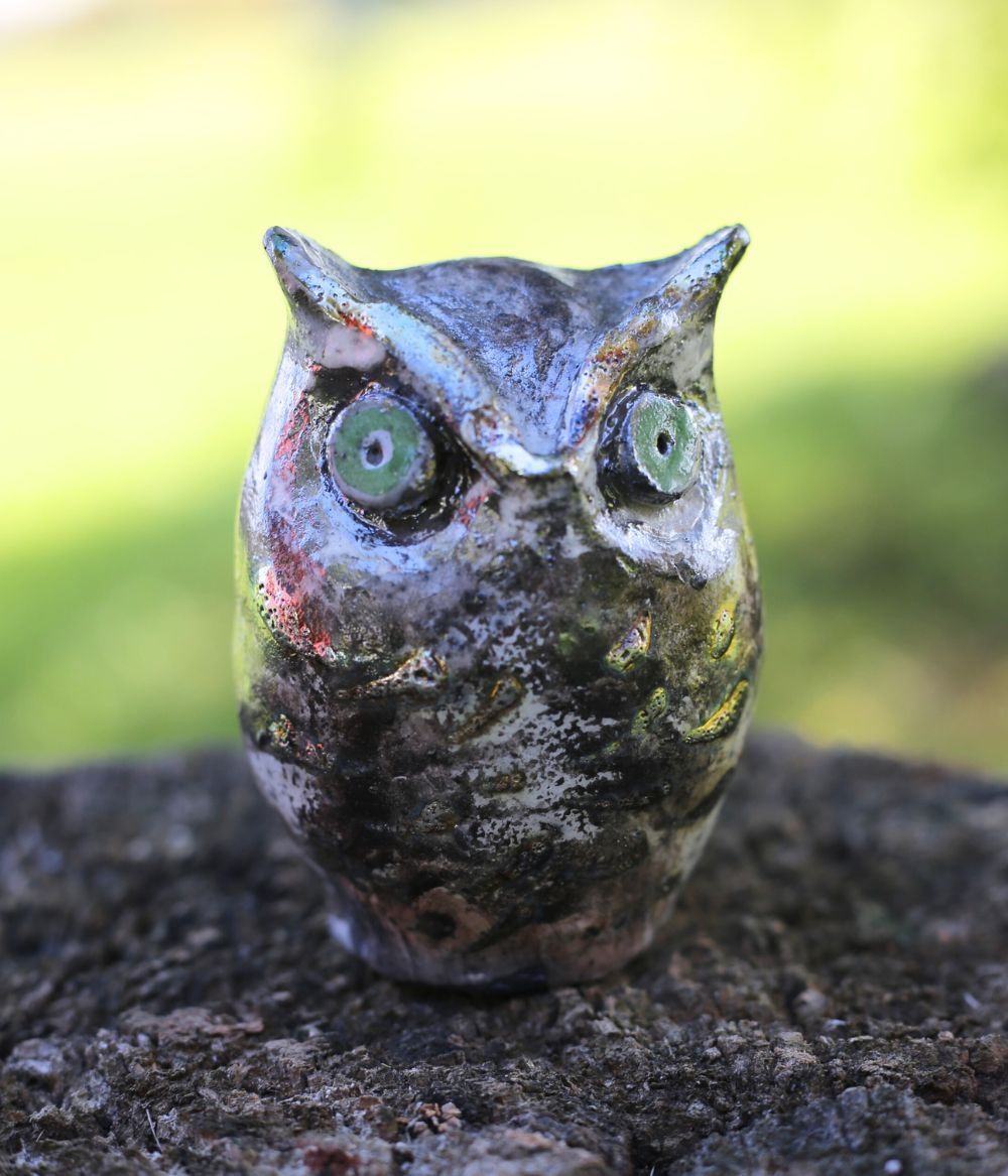 Careful hand glazing process and ancient raku firing bring a final surprise to each Bird of Happiness Owl making every single one entirely unique. There is a life happiness in each sculpture, born out of synergy of all four elements, fire, water, earth and air. Holding a bird of happiness owl in our hand we feel one with the nature.