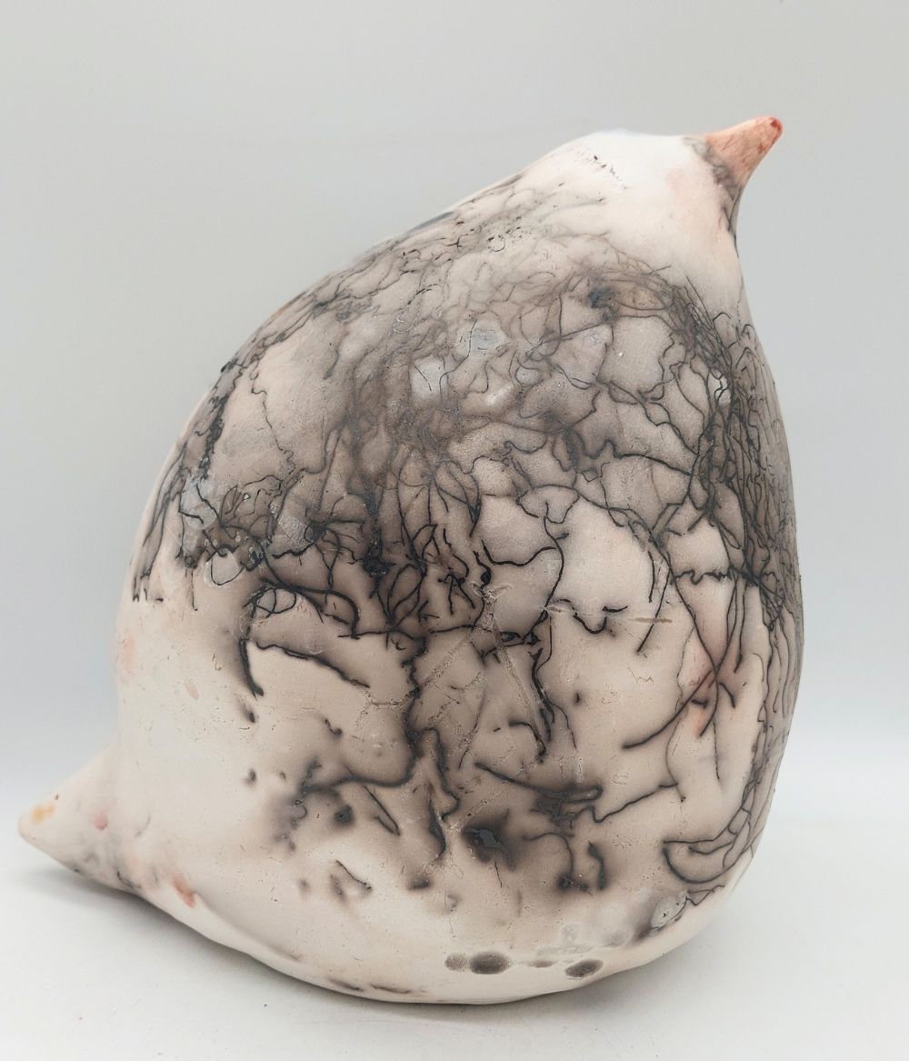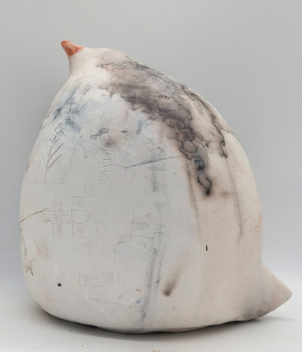 Ručno modelirana u mekoj glini. Ptica sreće Loza je izrađena u saggar tehnici u kojoj se keramički predmet čekićem i dlijetom polako oslobađa svoje ljušture koja je nastala nakon paljenja i izlazi iz nje baš kao ptica iz jajeta.