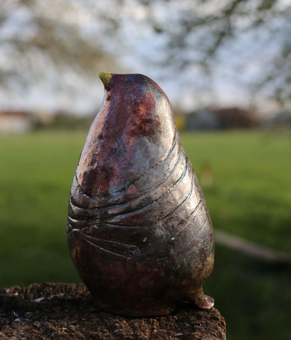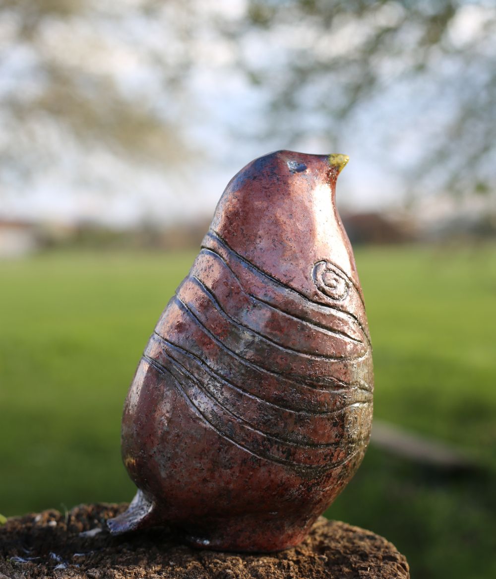 Apstraktna, stilizirana, unikatna keramička ptica. Modelirana, obrađena i glazirana ljudskom rukom. Nekoliko puta pečena u specijalnoj peći za keramiku na temperaturi od preko tisuću stupnjeva. Završno paljena u drevnoj raku tehnici.