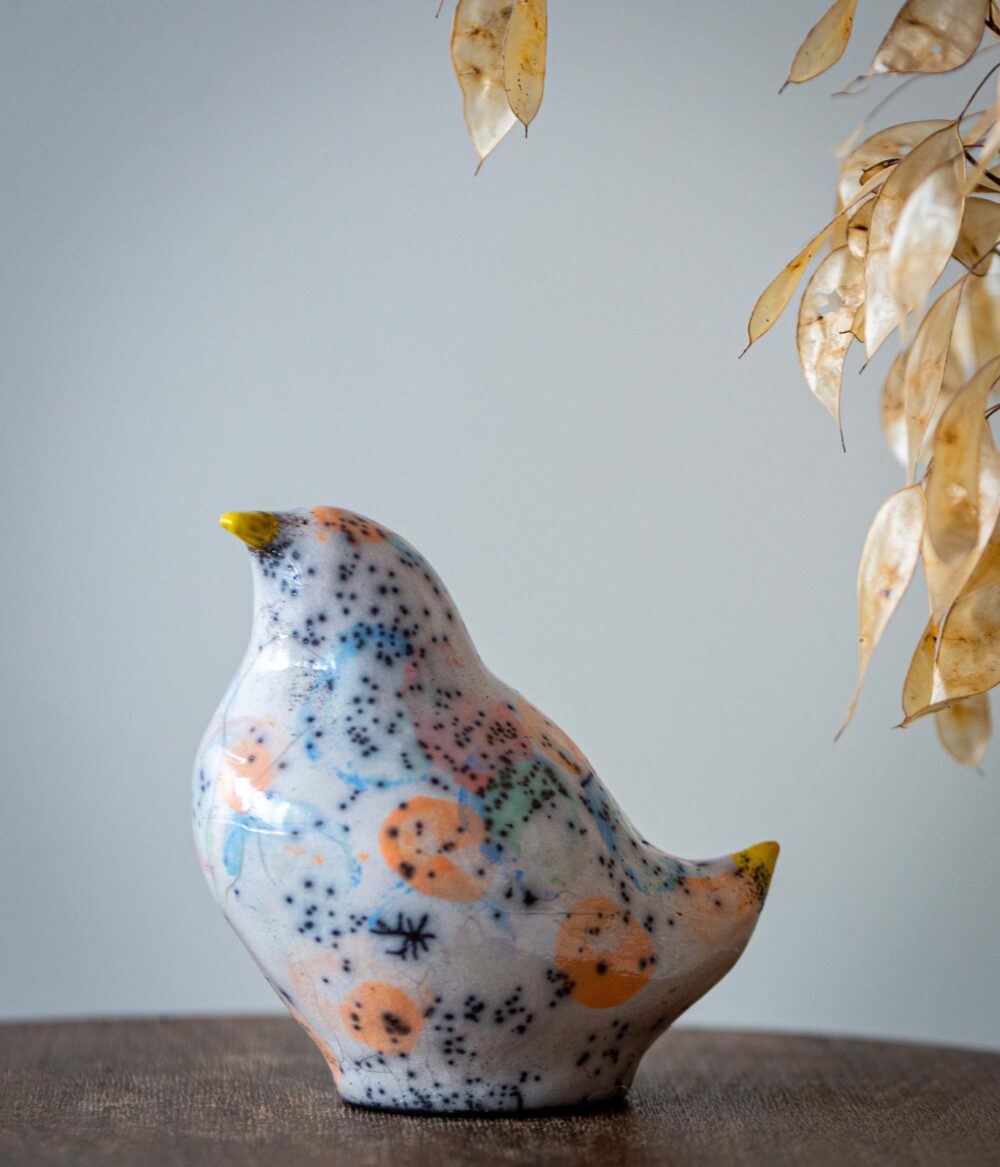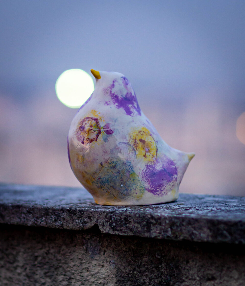 Proces ručnog glaziranja i završno paljenje u drevnoj raku tehnici daruju nam čudesno iznenađenje. Svaka individualna ptica nudi svoju originalnu priču, izražava radost življenja i potiče unutarnji mir koji proizlazi iz sinergije vatre, vode, zemlje i zraka. Držeći pticu u ruci osjećamo se sjedinjeni sa prirodom.